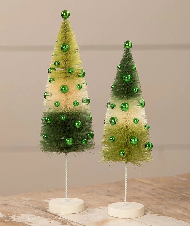 Bring whimsy to your decorating with these playful Green Tricolored Bottle Brush Trees with green bead embellishments.
