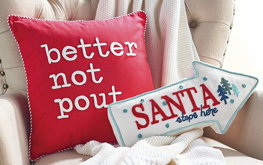 Create a playful Christmas mood with this fun embroidered Santa Stops Here Arrow Shaped Pillow.