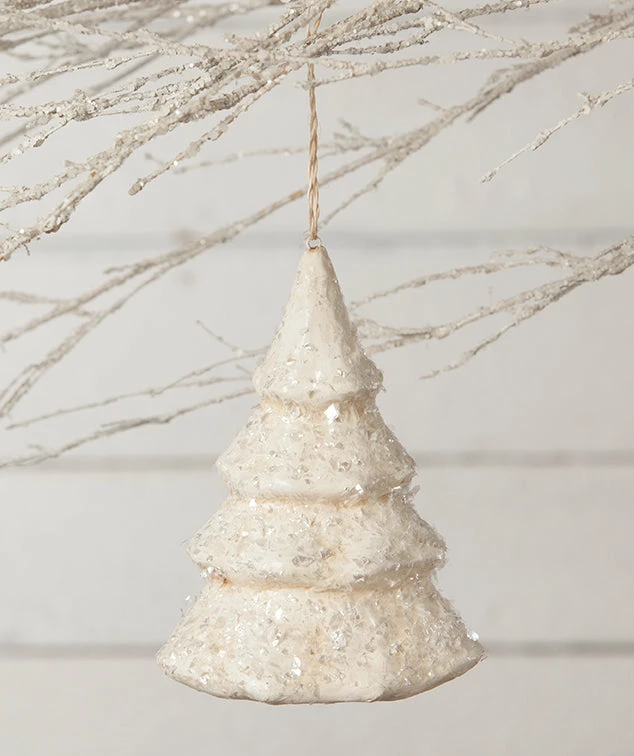 Dream up a merry little Christmas with this festive paper mache and mica Snowy Christmas Tree Ornament.