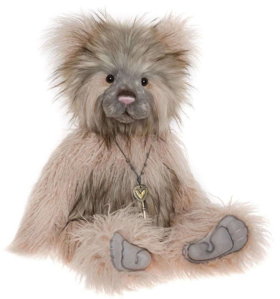 Bertha is a lovely big bear with long pink and gray plush fur.