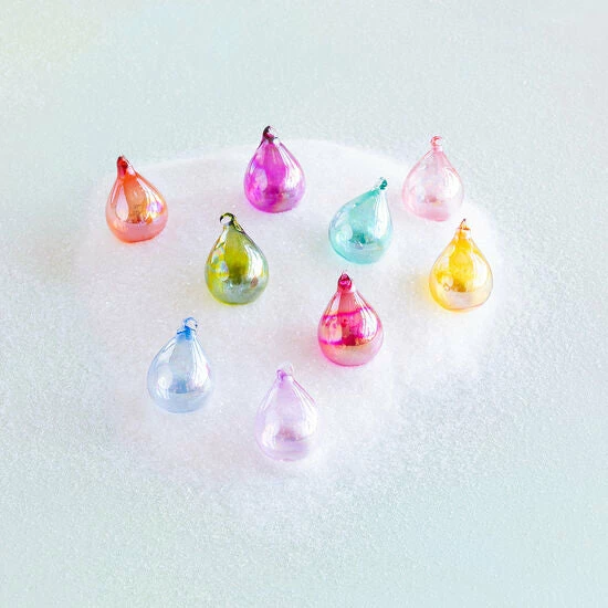 Bring cheer to your tree with these small colorful iridescent raindrop ornaments.