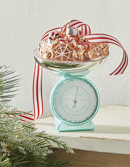 Trim your tree with cheer with this cute kitchen scale stacked with Christmas cookies.